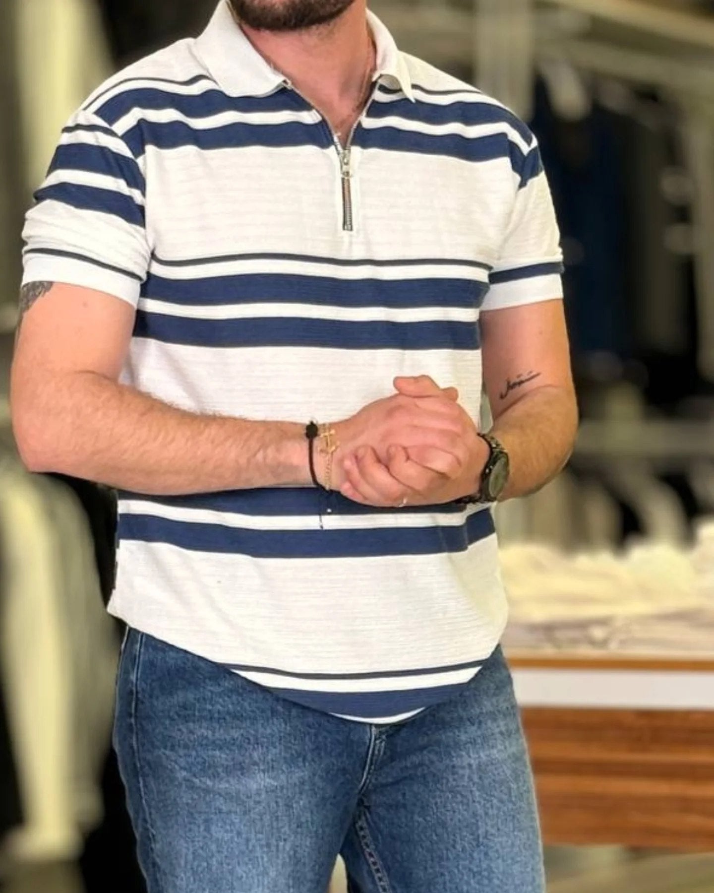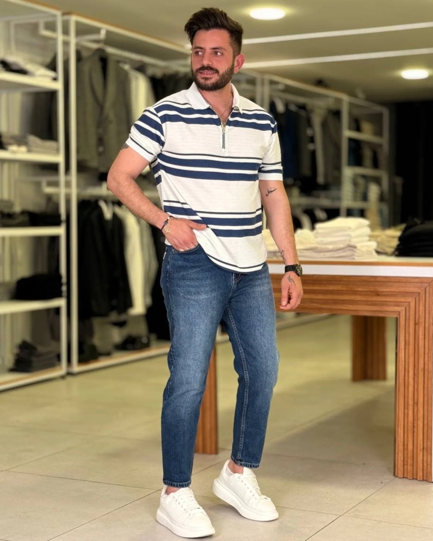 \nThe Blue/White Polo features a classic cut that flatters all body types. With a tailored fit, it offers just the right amount of room without being too loose or restrictive. The breathable fabric ensures you stay cool during hot summer days while remaining comfortably warm during cooler evenings. Whether you pair it with jeans for a relaxed day out or dress it up with chinos for a sharp look, this polo is sure to become a staple in your wardrobe. \nTimeless Design with Modern Touches