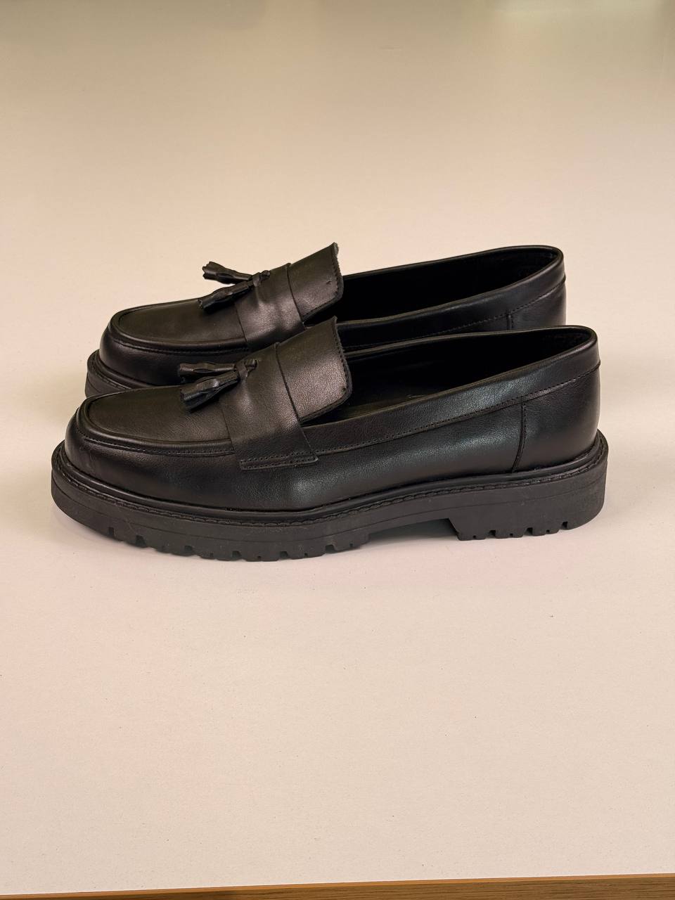 \nThese loafers' classic black finish makes them a timeless addition to any closet. Pair them with formal attire for a polished office look, or dress them down with jeans for a more laid-back vibe. Our Full Black Leather Loafers are designed to be versatile, reflecting contemporary trends while maintaining an elegant touch. With their sleek silhouette, they effortlessly harmonize with a variety of outfits and occasions. \n \nInvesting in a pair of Full Black Leather Loafers is investing in your style and comfort. Enjoy the luxury of high-quality craftsmanship that stands the test of time. Elevate your footwear collection with a pair that offers both sophistication and practicality.