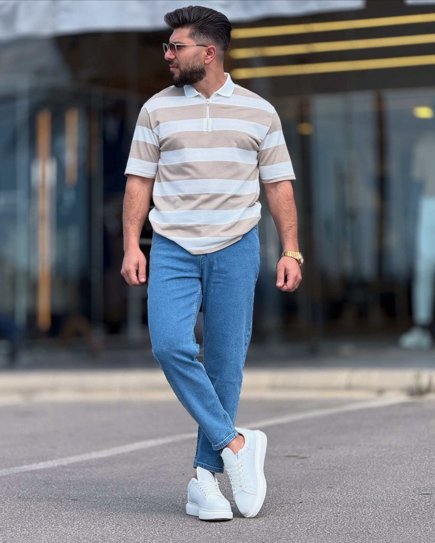 White & Beige Striped Polo